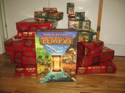 Vi mottok pakken vi bestilte fra brettspill.no. Vi har bestilt en del julegaver til oss selv om andre derfra. Karina var rask med å pakke alle inn, men Karl Thomas lurte Tempus unna. Den ville han ha med en gang.
