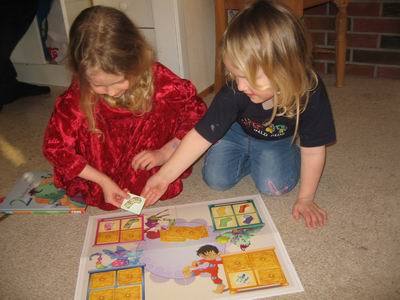 Pakken ble åpnet midt på gulvet og spillene måtte spilles med en gang der vi satt. Først spilte vi Lotto med åpen trekning. Karina hadde to brett og fikk nesten alle kortene i begynnelsen. Og jentene beholdt humøret. May Alise fikk nesten alle de siste kortene, - bortsett fra det ene av Karinas som kom helt til slutt.