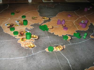 Vi prøvde spillet for første gang og oppdaget at det var et relativt tidkrevende spill. Og vi mistenker at det lett kan låse seg i en slags kald stillingskrig. Hvis spillerne har kjøpt opp alle karavanene for tidlig, ender de opp med å ikke ha tilgjengelig de resursene som må til for å kjøpe helter og undre. Det kan derfor ende opp i et evigvarende spill der ingen når spillets mål. Karl Thomas spilte Babylonerne som bredde seg raskt ut over Tyrkia og Midtøsten. Karina spilte Kartageerne som koste seg med masse resurser på et svært lite område. Morten spilte Hellenerne og bygde båter i massevis. Han kontrollerte Middelhavet og var lenge den eneste som hadde militære styrker. Karina og Karl Thomas var nok litt naive. Plutselig angrep Morten først i Karinas område og så i Karl Thomas sitt. Men han gapte nok over for mye og ble slått tilbake. Etter 2.5 time, ga vi oss. Da hadde ingen kjøpt undre eller helter. Og vi så at ingen ville komme til å vinne på en god stund til. Uansett, spillet skal ha pluss for sine mange muligheter og enkle kampregler. Men tidsbruken og muligheten for kald krig, trekker ned. Det er absolutt ikke et spill for Karina. Kanskje spillet er bedre med flere spillere. Karl Thomas tror det ville bølget masse med flere spillere. Han liker spill der det blir trangt.