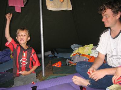Vi prøvde ut Quackle! allerede samme kveld i lavo'en. Vi lå på Silkeborg Sø Camping og skulle roe barna ned før leggetid. Barna ble ikke akkurat rolige av dette spillet, men vi hadde det gøy. Quackle er underholdende og kjapt, Mathias fant ut et tyvtriks; han sa andres dyrelyd idet de la ned kortet sitt. Han tok en sjanse, sa han. Så da fant vi ut at hvis man sa en lyd uten at det var to like der, så måtte man trekke inn sin egen bunke. Quackle! blir morsommere jo kjappere man spiller. Vi måtte trekke opp mange ganger, - og heldigvis tok alle det med et smil. Det var nemlig ikke så lett å si riktig lyd. Karina vant.