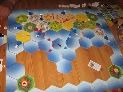 På besøk hos Anita og Per fikk vi et gjensyn med Byer & Riddere. Per kom best ut og fikk alle mot seg. Anita fikk varer puljevis og hadde derfor enten mye eller lite kort på hånd. Karina og Karl Thomas tok Per igjen poengmessig. I nest siste runde hadde Karl Thomas 12 poeng, men så stakk Karina av med både lengste handelsvei og kjøpmannen. Dermed gikk hun opp til 13 poeng og vant.