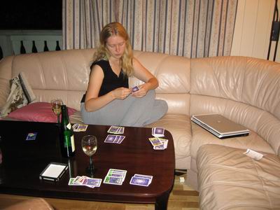 Selv om vi var trøtte, tok vi et raskt spill. Space Beans er fint sånn. Det krever ikke mye hjerneaktivitet og det går fort. Karl Thomas hamstret mye poeng i starten, mens Karina måtte kaste sine kort gang på gang. Til sist bestemte hun seg for å legge ned alle enere hun kom over og høste dem etterpå. Karl Thomas ledet 12 mot 2 poeng før Karina kom i gang. Hun tok innpå og Karl Thomas vant 33 mot 29 poeng.