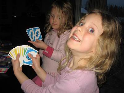 Jentene var veldig ivrige. De hadde fått velge spill og blitt enige om UNO. Anne Maline vant.